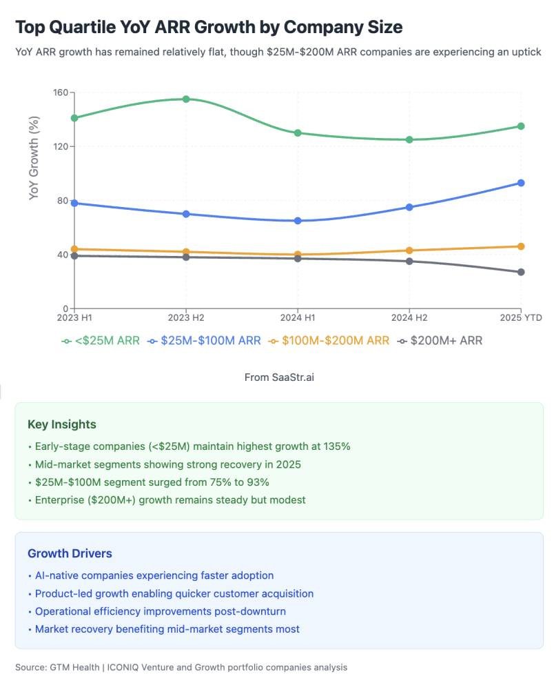 “The Mid-Stage Breakout: Companies in the $25M-$100M ARR range are finally breaking free from what many call the ‘growth plateau.’” — SaaStr on ICONIQ’s 2025 findings