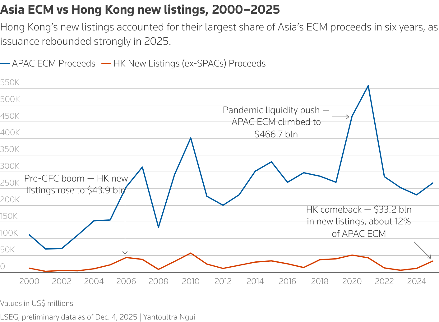- The center of gravity has shifted. The Bamboo Works reports that 2025 policy changes pulled offshore listing activity back to Asia, helping Hong Kong top global IPO rankings. CNBC observed a clear retreat from U.S. listings.